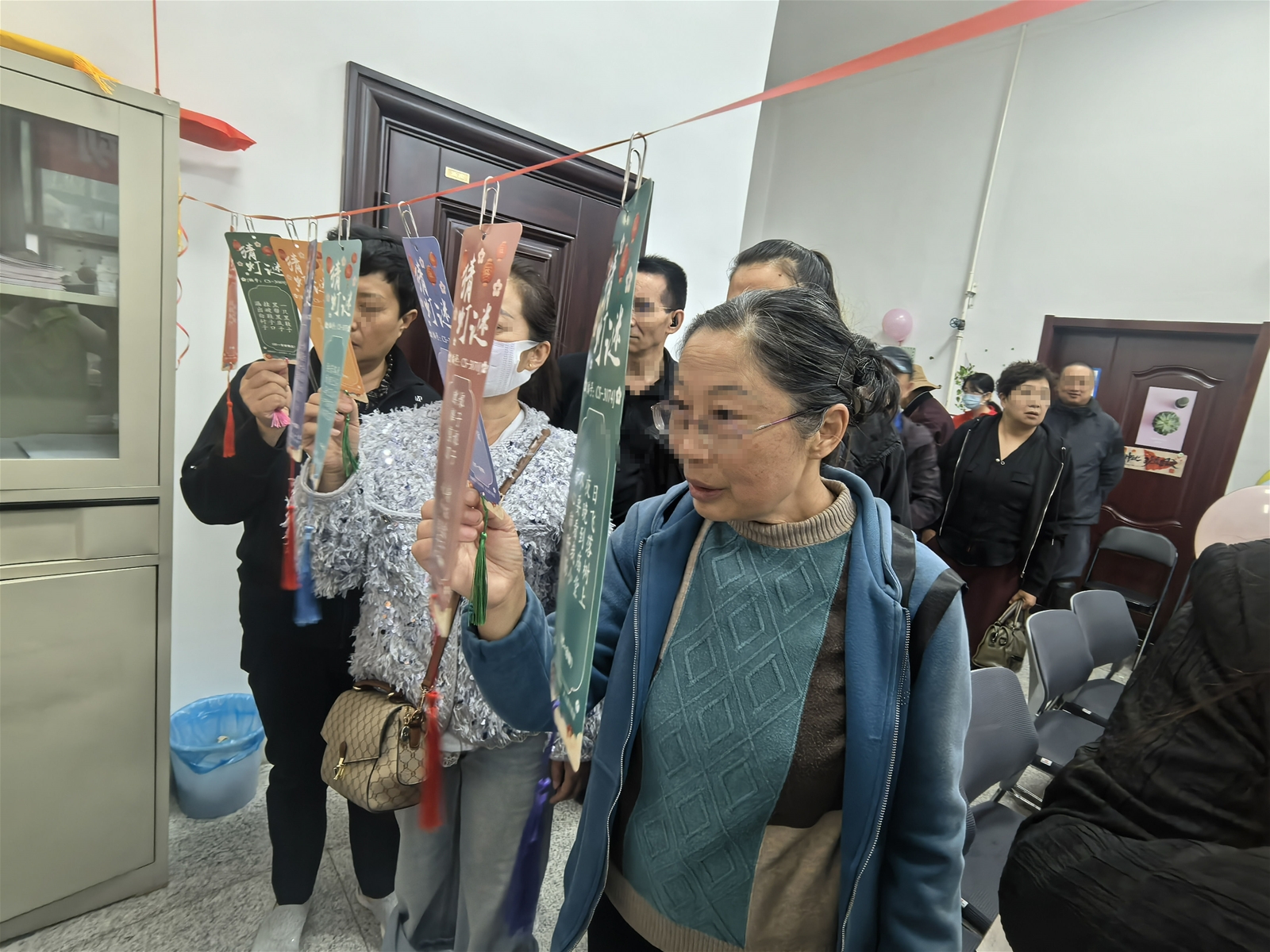 第二个活动区域是“猜谜语”,这里用趣味对话搭建起一处化解孤单的“情绪疗愈角”,让照护带来的沉重悄然消散。二十条彩色谜语卡片悬挂在绳上,像一个个藏着惊喜的小灯笼,瞬间勾起大家参与热情。现场的讨论声成了最温暖的底色。没人再独自沉默,三五成群围在一起,你一言我一语地热烈交流。“海上一只鸟,跟着船儿跑,冲浪抓鱼,不怕大风暴’,这肯定是海鸥!”一位阿姨笃定的声音刚落,旁边几位家属立刻点头附和,脸上露出“原来如此”的豁然笑容,彼此的默契在瞬间升温。遇到较难的谜语时,总有热心的家属主动递上思路:“你看提示里说‘与月亮有关’,再结合中秋习俗,是不是‘月饼’呀?”讨论中对谜题的好奇、对答案的期待,以及与他人交流的轻松;有家属看到其他家属猜对时,主动鼓掌喝彩,家属间的距离在欢声笑语中被彻底拉近。有家属猜对谜底,宁养院工作人员便递上一根棒棒糖作为奖励。家属们剥开糖纸时,甜意顺着味蕾蔓延,脸上的笑容也愈发灿烂。