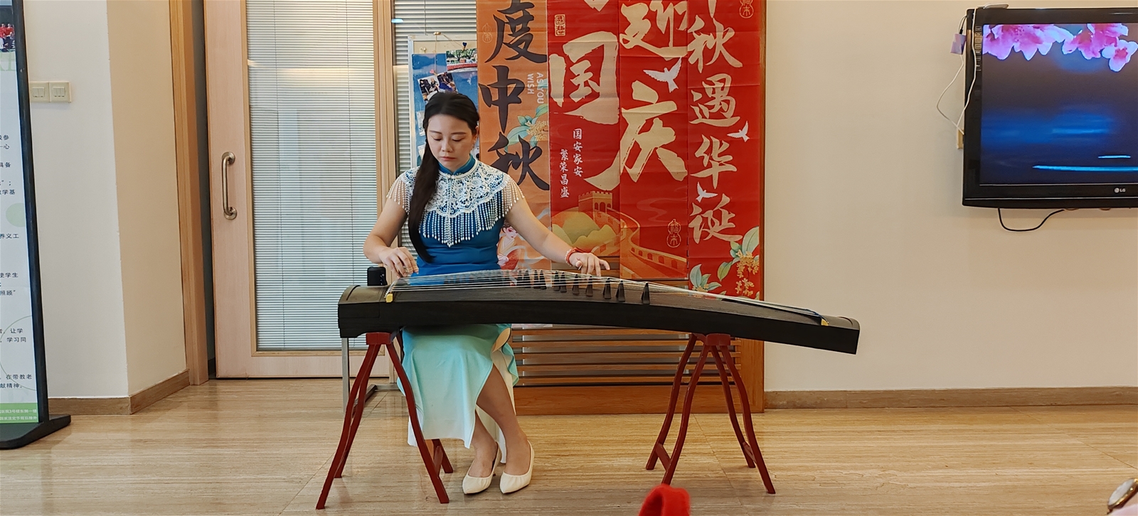 本次活动邀请了一位具有古筝才艺的宁养义工陈老师为患者和家属现场演奏。演奏前,身着华丽旗袍服饰的陈老师通过精心准备的课件,向患者和家属介绍了古筝的发展演化史、演奏技巧及赏析方法。随后,她为大家带来《青花瓷》、《荷塘月色》等耳熟能详的流行曲目。当悠扬的琴声缓缓流淌,时而似明月高悬,时而如清泉潺潺,将国庆的热烈与中秋的静美交织在一起。让大家在聆听美妙音乐的同时,也拓充了音乐文化知识。不少家属表示,这是第一次现场聆听古筝演奏,获得了全新的视听体验;知晓了赏析方法后,更能融入音乐的意境,获得心灵的放松与滋养。