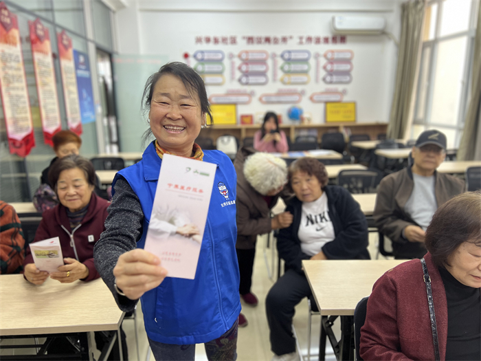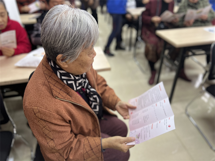 活动现场气氛热烈,温情洋溢。活动伊始,社区居民齐声高唱红歌,激昂的旋律中饱含对生活的热爱与向上力量;随后的手指操互动环节,大家跟随节奏活动手指、舒展筋骨,在轻松有趣的氛围里掌握实用的日常保健方法,收获健康与愉悦。社工侯蓉结合居民实际生活场景,用通俗易懂的语言详细讲解防跌倒知识和应急应对技巧,为老年群体居家安全构筑坚实“防护墙”;宁养院刘冰新主任则聚焦居民核心关切,系统介绍宁养医疗服务的覆盖范围、申请流程等关键内容,帮助居民全面了解这一专业医疗资源,消除宁养信息盲区。