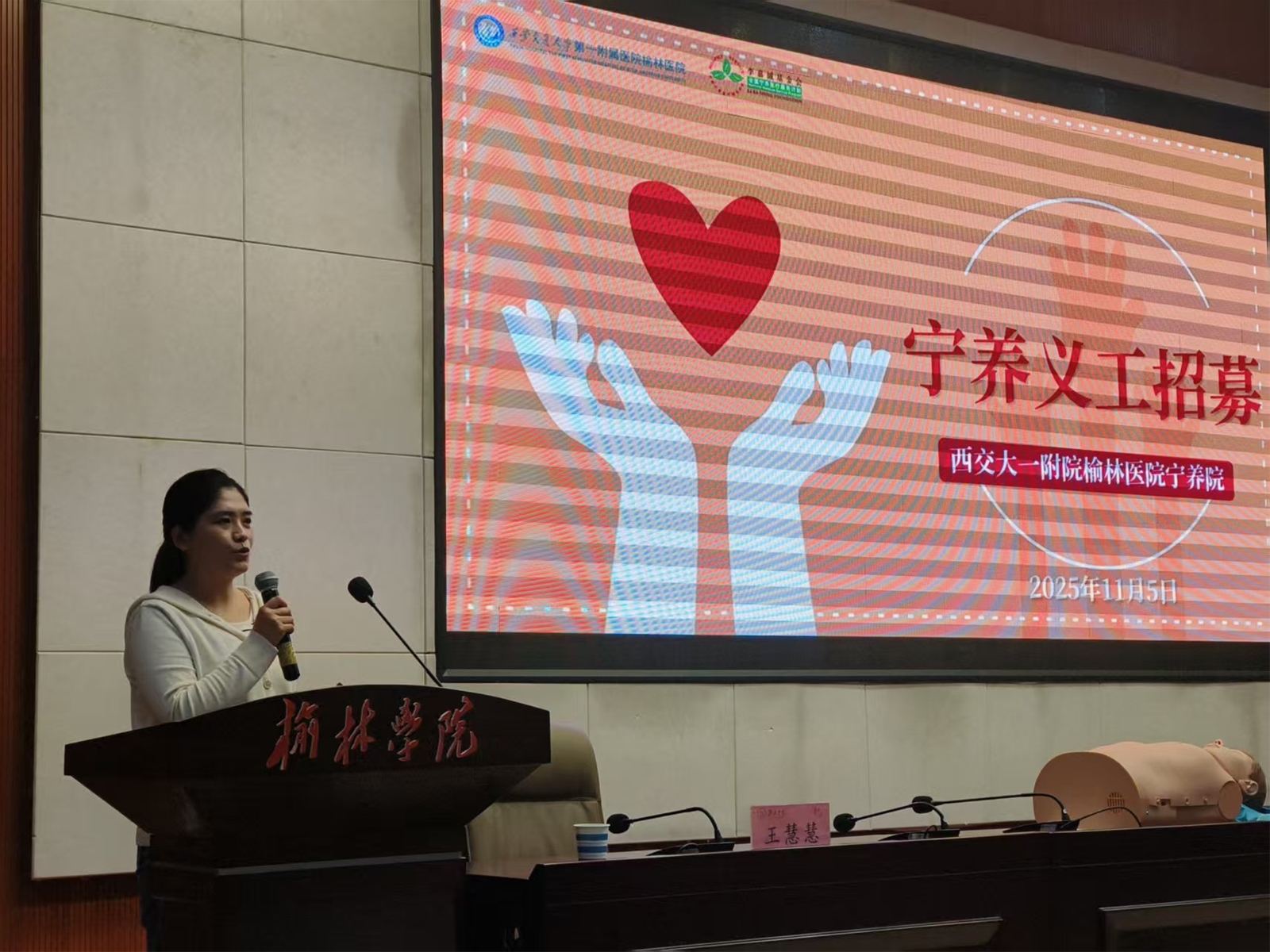 2025年11月5日,西安交通大学第一附属医院榆林医院宁养院人员走进榆林学院数学与统计学院,向在校大学生详细介绍李嘉诚基金会全国宁养医疗服务计划及榆林宁养院的服务,并现场分享了宁养义工的发展现状与服务案例,号召富有爱心和责任感的同学们积极加入宁养义工队伍,为家庭经济困难的晚期癌痛患者及其家庭送去社会的温暖与支持,约有60多名同学参与。