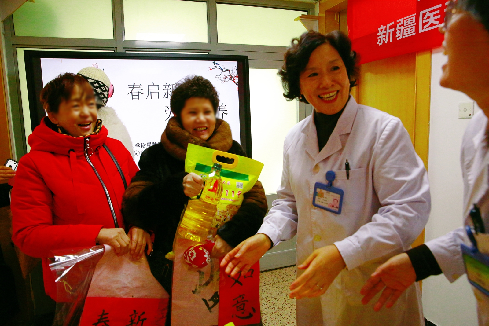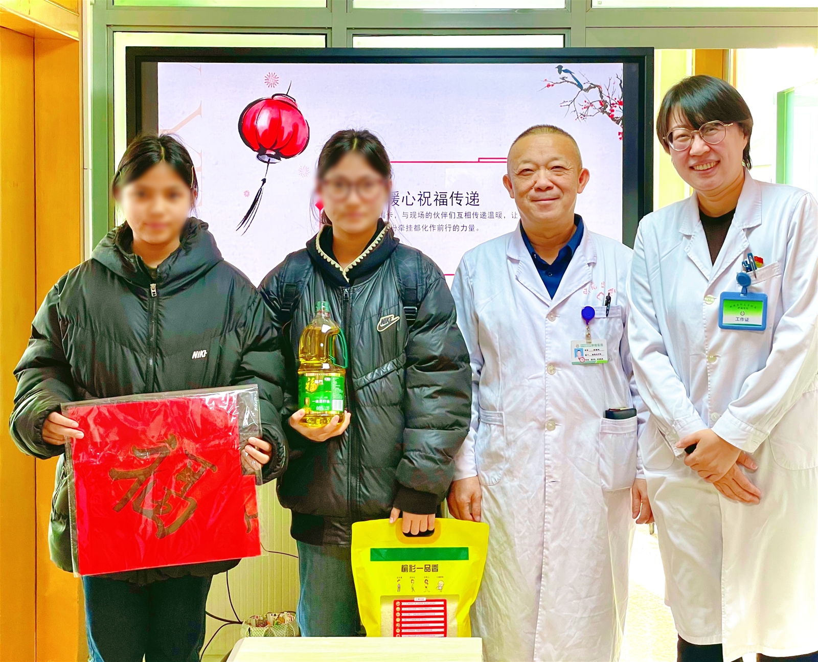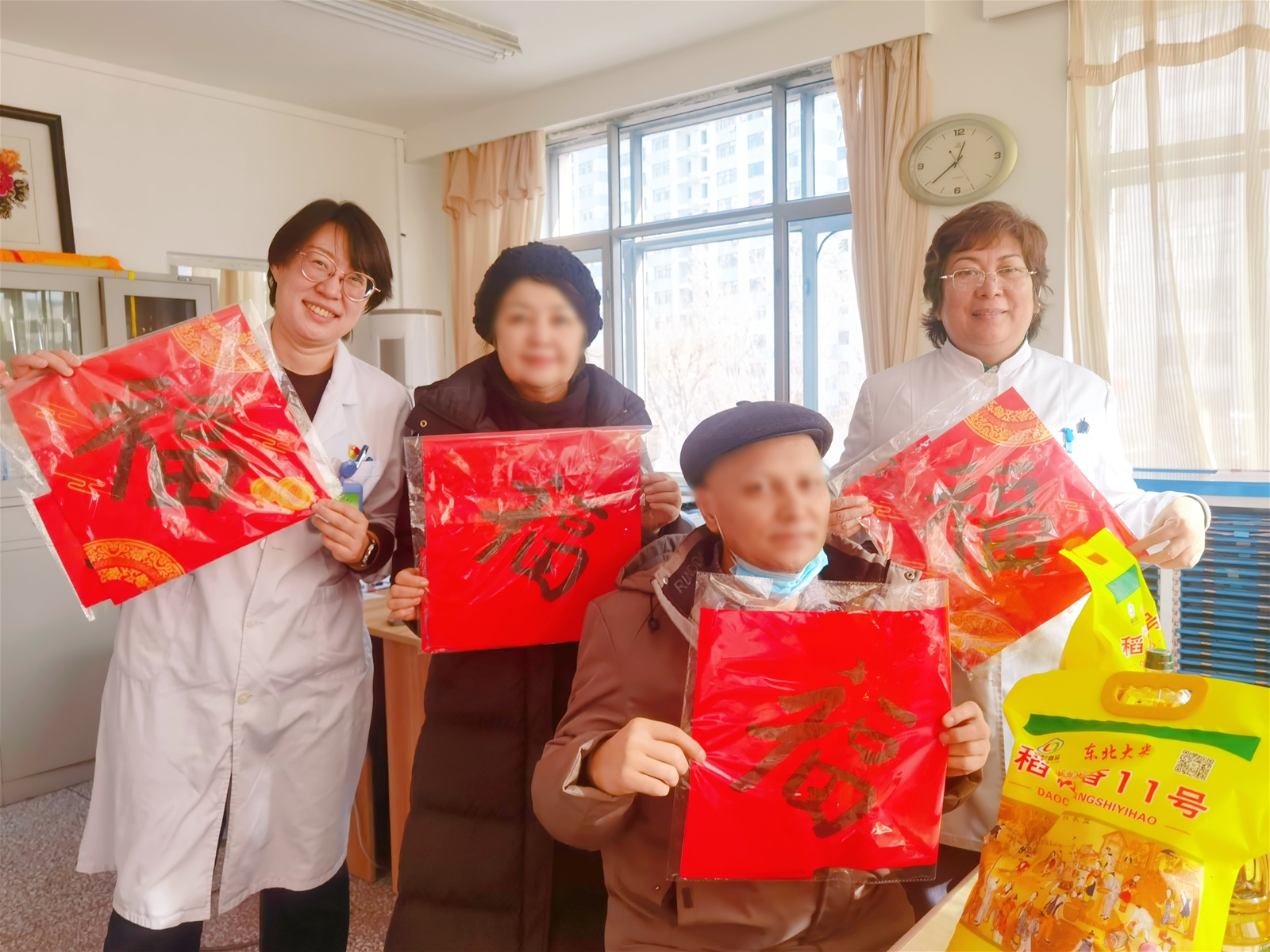 活动最后,大家不仅互相传递着祝福的话语,更收获了沉甸甸的温暖。社工提前一周就联络了长期合作的爱心人士,为现场的患者及家属准备了新春慰问礼包——每一份都装着大米、食用油等生活品,搭配着红彤彤的春联和福字,既喜庆又实用。