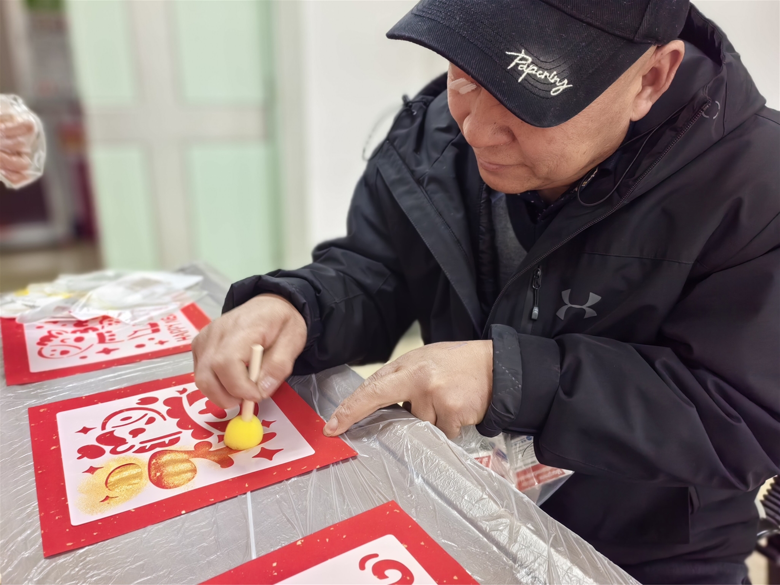 活动从拓印“福”字开始。考虑到参与者的体力状况,社工李玥特意准备了海绵蘑菇刷和金色丙烯颜料,轻压几下便能拓出饱满图案。几位手部无力的患者在家属及宁养工作人员的轻握协助下,共同完成了人生中第一张自制年画。