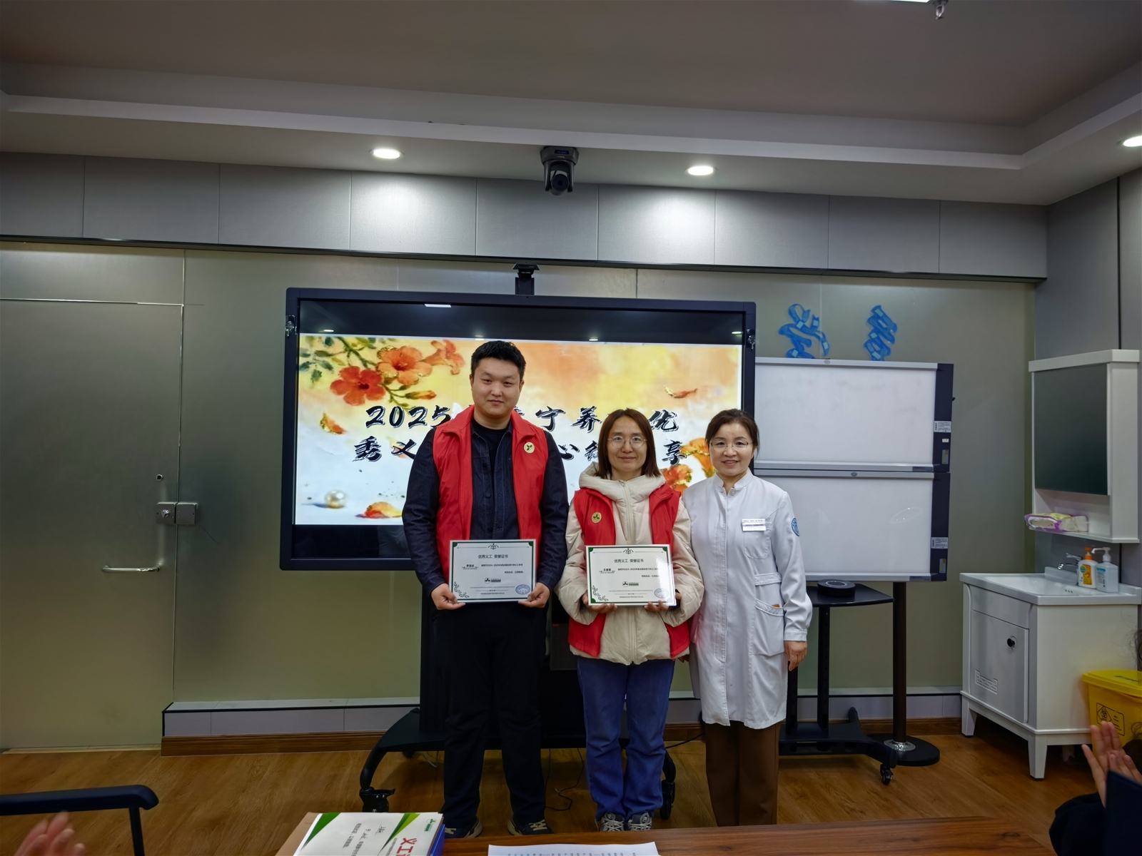 表彰环节将大会推向高潮。主持人沈雯宣读表彰名单,义工王春丽、李浩达分别荣获“2025年度优秀义工”证书,并双双获得“年度服务时数达标奖”(服务满48小时)。他们的付出与坚持,是宁养义工精神的最好体现。