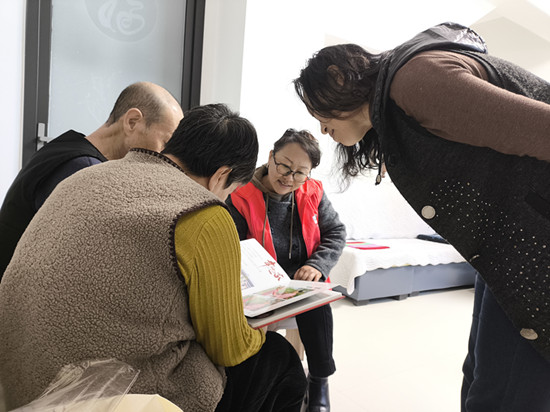 当患者 (穿黑上衣) 和家属收到义工送到的“爱的留影”相册时,不断地夸赞:“拍得真好!”