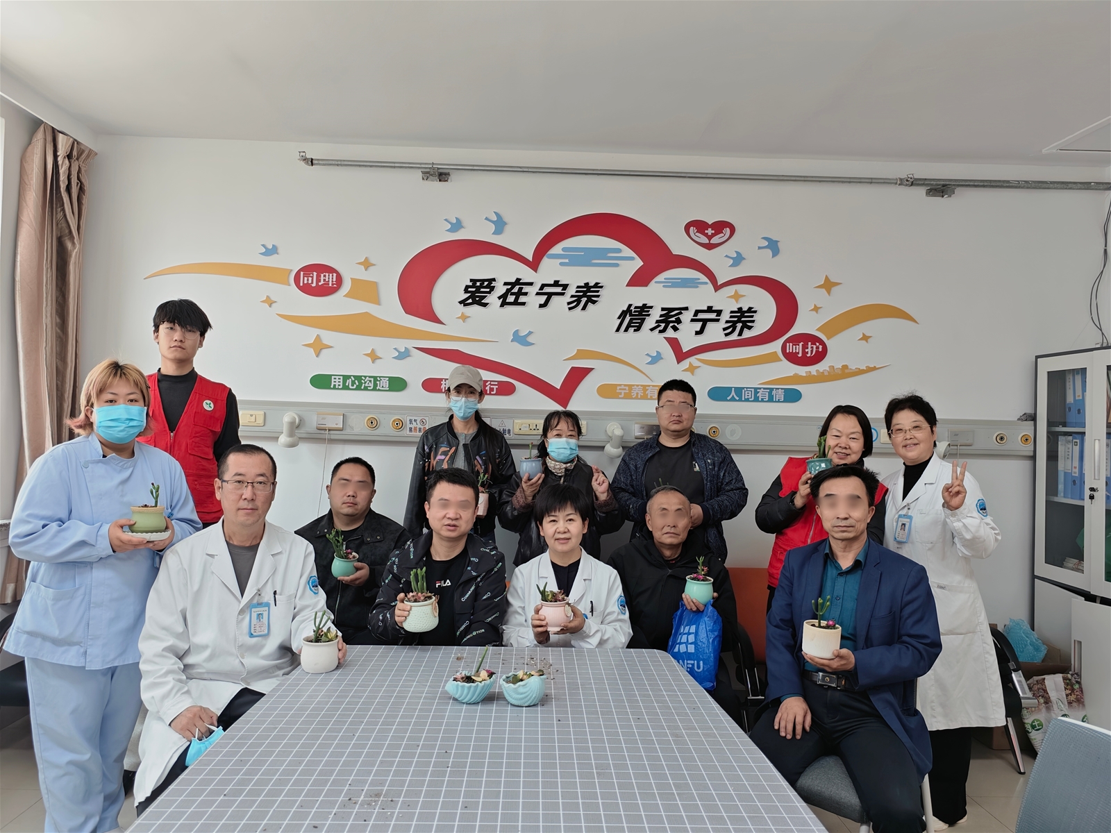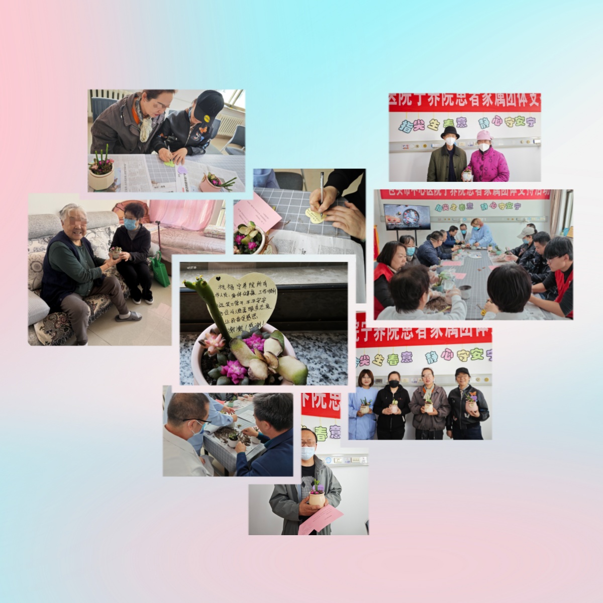 随后的多肉种植与祝福卡书写环节,让活动充满温情与暖意。社工详细讲解多肉栽植与养护知识,医护人员、义工全程陪伴互动,家属们动手栽种绿植,在指尖劳作中暂时忘却照护辛劳,感受春日生机。书写祝福卡时,大家提笔写下对亲人的祝愿、对生活的期许,遇到书写困难的家属,身边同伴主动帮忙,尽显邻里般的暖心互助。