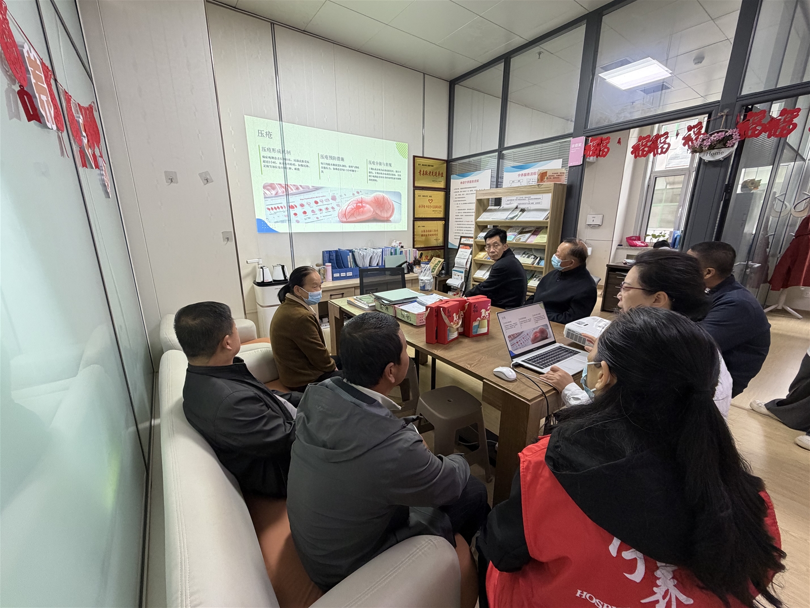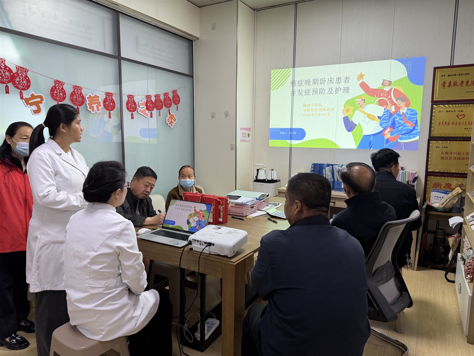 为提升晚期卧床患者家属的居家照护能力,帮助家属科学预防压疮、肺部感染、深静脉血栓等常见并发症,为患者提供更优质、舒适的照护服务,2026年4月21日,西安交通大学第一附属医院榆林医院宁养院于办公室内举办了“卧床患者并发症的预防及护理”主题家属教育团体活动,本次活动10名患者家属参与。