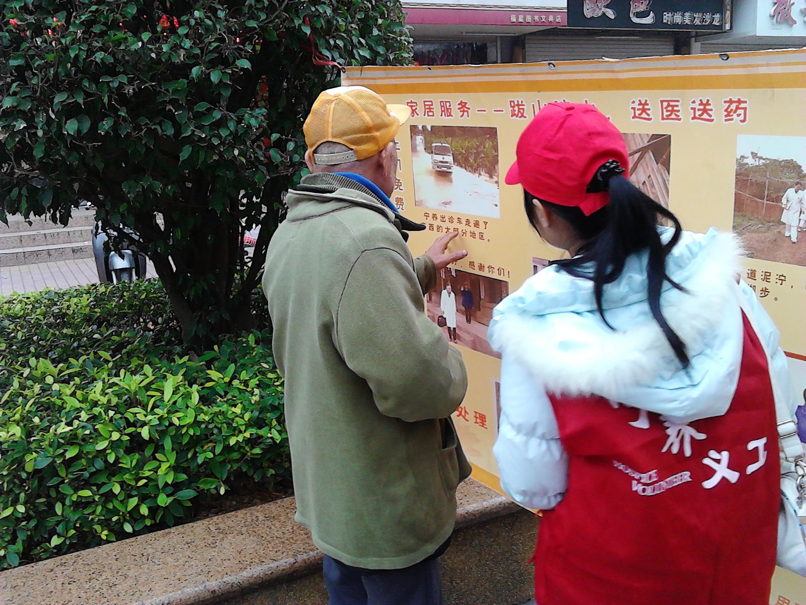 天微亮,雾气弥漫,偏冷,宁养义工们早已集合出发。八点半左右与民大社工系志愿者、社区志愿者会面,在社区居委会的帮助下,顺利地拉出横幅,摆出展板。做好了宣传准备之后,义工们积极地为社区居民介绍宁养服务,社区居民也对于宁养的工作产生兴趣,围在展板前聆听义工的讲解;部分义工开展调查问卷,在翠湖新城内撒开大网;以莫丽英大姐为首的社区志愿者热情参与宁养服务的宣传工作,也为做调查报告的宁养义工带路。在这期间,宁养义工和莫丽英大姐也去探访了社区里接受宁养服务的患者黄先生,为他带去了些生活用品。