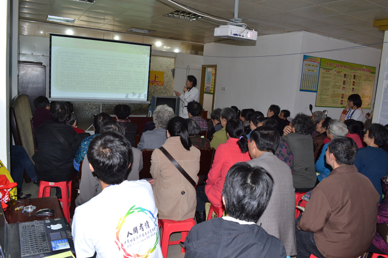活动设计之初,策划者围绕参与者主要为老人,选择老人所关心的健康问题为切入点,设计了“饮食健康与防癌”健康讲座。社区宣传活动正值清明节前夕,在健康讲座之外,加入了“生命分享”,邀请老人分享对死亡的看法及对当下生活的态度等。为了更好的宣传宁养服务,在活动开始前派发宁养服务宣传单张。活动有序进行,达到预期目标。