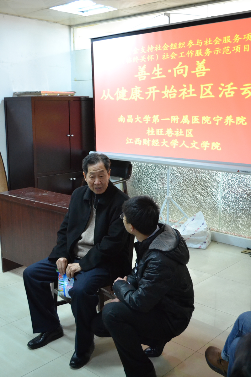 2013年3月29日下午2:00,由南昌大学第一附属医院宁养院、东湖区百花洲街道桂旺巷社区及江西财经大学人文学院共同举办的“善生·向善,从健康开始”社区宣教活动成功开展。本活动为社会工作教育协会宁养(临终关怀)社会工作服务示范项目的系列活动之一。