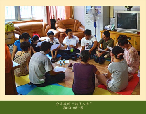 上午9点,活动开始,第一环节,宁养院社工带领家属进行热身游戏“坐地而起”。首先,邀请一位家属坐在地板上,然后不能用手脚及借助外力,尝试能否站起来,家属完全没有办法站起来;接着让家属借助脚,站起来了。社工引喻,当我们遇到困难、挫折,例如即将面临的亲人的失落,就像是我们在人生的道路上摔跤了,坐在地上,如果我们没有支持及让自己站起来的方法,我们将一直坐在原地,没有办法在人生的道路上前行。社工又邀请另外一个家属尝试用前一个家属站起来的方式让自己站起来,没有成功。社工指导家属用自己的方式加以尝试。家属用自己的方式成功站起来了。社工引导家属认识到,处理亲人离去的哀伤情绪需要有适合自己的方式。随后,社工邀请家属体验2人一组及5人一组协调一致坐地而起,感受相互支持的力量,引导家属在面对亲人过世的哀伤时,学会分享,寻找相互支持者。社工告诉家属,宁养院始终是家属的支援团,有需要支持就跟宁养院联系。