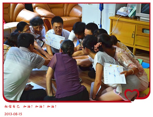 进入第二环节,社工带领家属绘制自己的生命线,梳理人生起伏的重要事件,并带领家属分享自己的起伏人生。一位家属分享“以前的生活很艰苦,家里小孩多,童年过得很艰苦,15岁下乡后,有很多的伙伴,很开心,后来结婚了,生活慢慢的好起来了,现在儿女都成家了,感觉很幸福,可是突然家里有得了这样的病,非常难过……”社工耐心辅导,引导家属观察其他人的生命线,协助家属总结,每个人都曾经遇到了当时对自己来说非常困难的时刻,但是大家都坚持过来了,我们应当相信每个人都有自我恢复正常生活的能力,同时邀请家属将手叠在一起,社工问家属“相信自己有能力面对一切困难,有没有信心?”家属以震耳欲聋的声音回答“有”,并齐声呐喊“加油,加油,加油”!有家属说感受到了一股暖暖的力量,感受到了团体的力量,自己更有力量面对接下来的一切困难了。