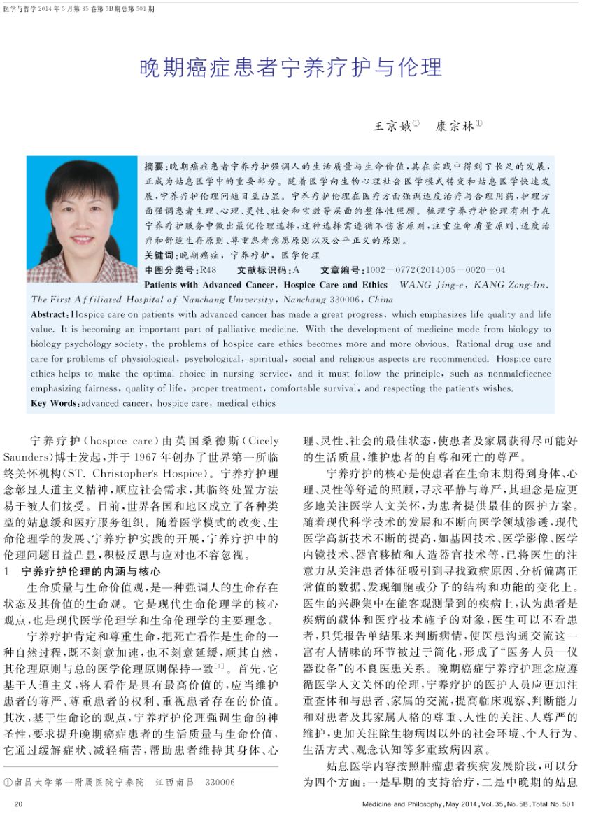 【医学与哲学】晚期癌症患者宁养疗护与伦理(王京娥,康宗林)