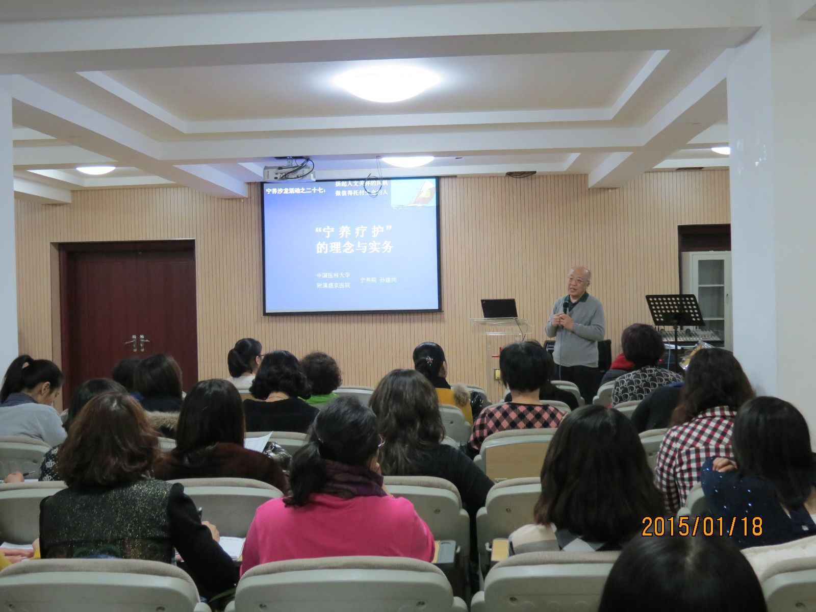 为进一步加强与西塔教会的合作关系,促进临终关怀志愿者对生命医学和人文关怀的认知,树立“助人自助”的志愿服务理念,继2014年组织部分社会义工和大学生志愿者旁听“患者家属学校”课程和参加“医患座谈会”等形式进行宁养理念和相关知识的培训活动后,1月18日孙建纯医师亲自到西塔教会为教会同仁进行宁养理念与实务的宣讲。西塔基督教会临终关怀志愿服务队的社会义工及宁养院的学生义工共50余人参加了本次培训。
