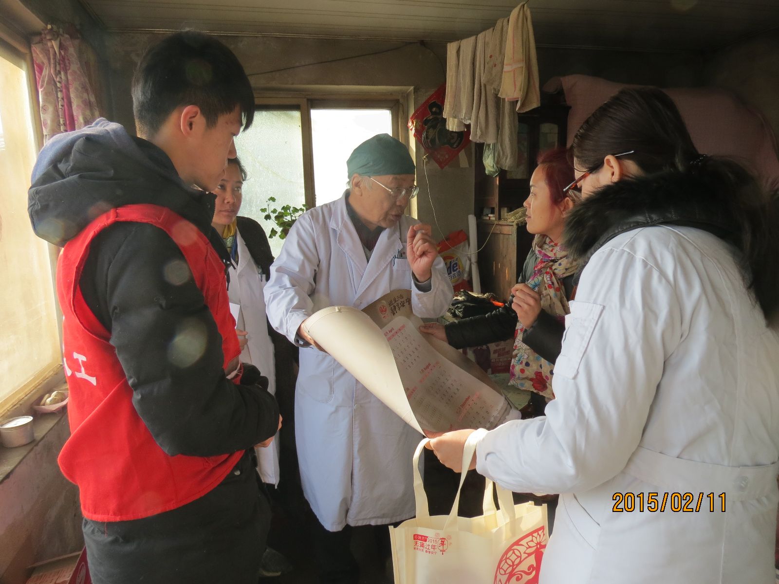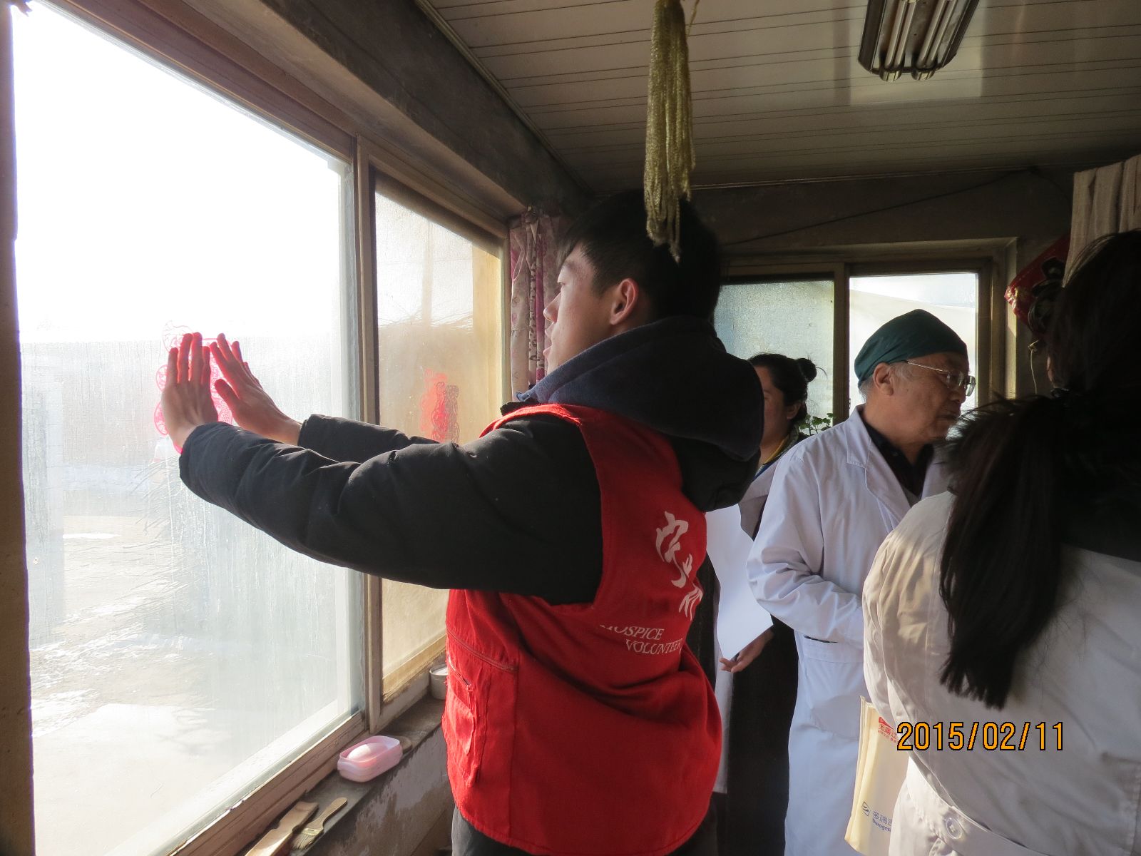 义工跟随医务人员走街串巷到患者家中贴窗花