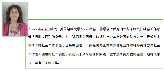 2015年的“姑息医学大会”另外有一个“历史性时刻”——大会特别邀请美国纽约大学Silver社会工作学院临床教授Dr. Susan Gerbino进行主题演讲,题目为《社会工作对于姑息治疗与临终关怀的贡献》。Gerbino教授多年来一直担任纽约大学“姑息治疗与临终关怀社会工作者资格培训项目”负责人,该项目包括硕士及硕士后培训课程及实务督导,为在姑息治疗与临终关怀领域从业的社会工作人员提供资格培训及领导能力进阶训练。她在姑息治疗与临终关怀领域与医生、护士、牧灵人员、社会工作者及心理治疗师等跨专业团队成员共同合作30多年。她在报告中介绍了1965年以来美国姑息治疗社会工作的发展历程,并指出,在美国,社会工作者是为接受姑息治疗及临终关怀的患者及其家人提供社会-心理照顾的最大精神健康专业团队,从业者大多数拥有硕士或博士学历。
