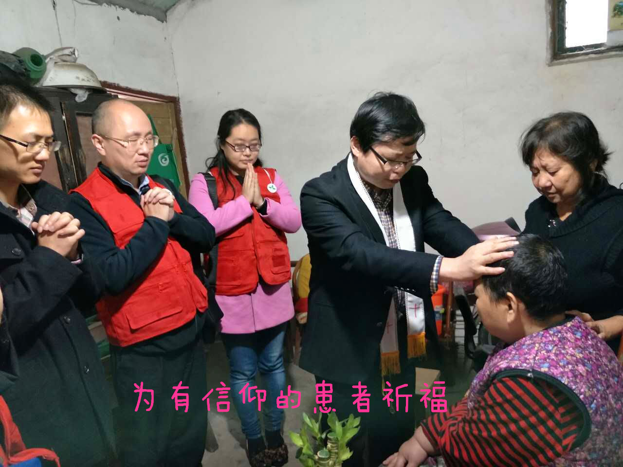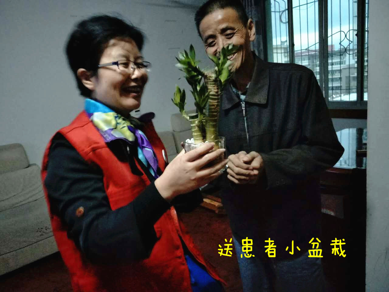 康老师带领社会义工一同探访至患者家中,首先由社工向家属介绍探访的义工,然后义工送上精心挑选的“生命之草”小盆栽,引导和鼓励患者在平日生活中用一颗欣赏的心观察身边美丽的景象,患者见到小盆栽后都露出了开心的笑容。其次,义工分工协作,部份义工与家属交谈,向他们探问患者的喜好、以往的经历、患病后的生活状态等。同时,了解家属与患者之间的关系、家属照顾患者的感受、帮助家属纾压。通过与患者的交流,部份义工知道他们的基本情况、平日生活的状况后,适时送出装有心态调整讲座的MP3,并陪伴他们一起听讲座,一起探讨疾病的认识,鼓励他们平时多听听讲座,调整心态。又给书籍《癌症不是绝症》,引导他们积极坦然的面对自身的疾病,爱自己,为自己祈祷。然后,对于有信仰的,我们在征得他们和家属的同意后,由神父主持祝祷。最后,大家与患者和家属合影,以表鼓励和支持。