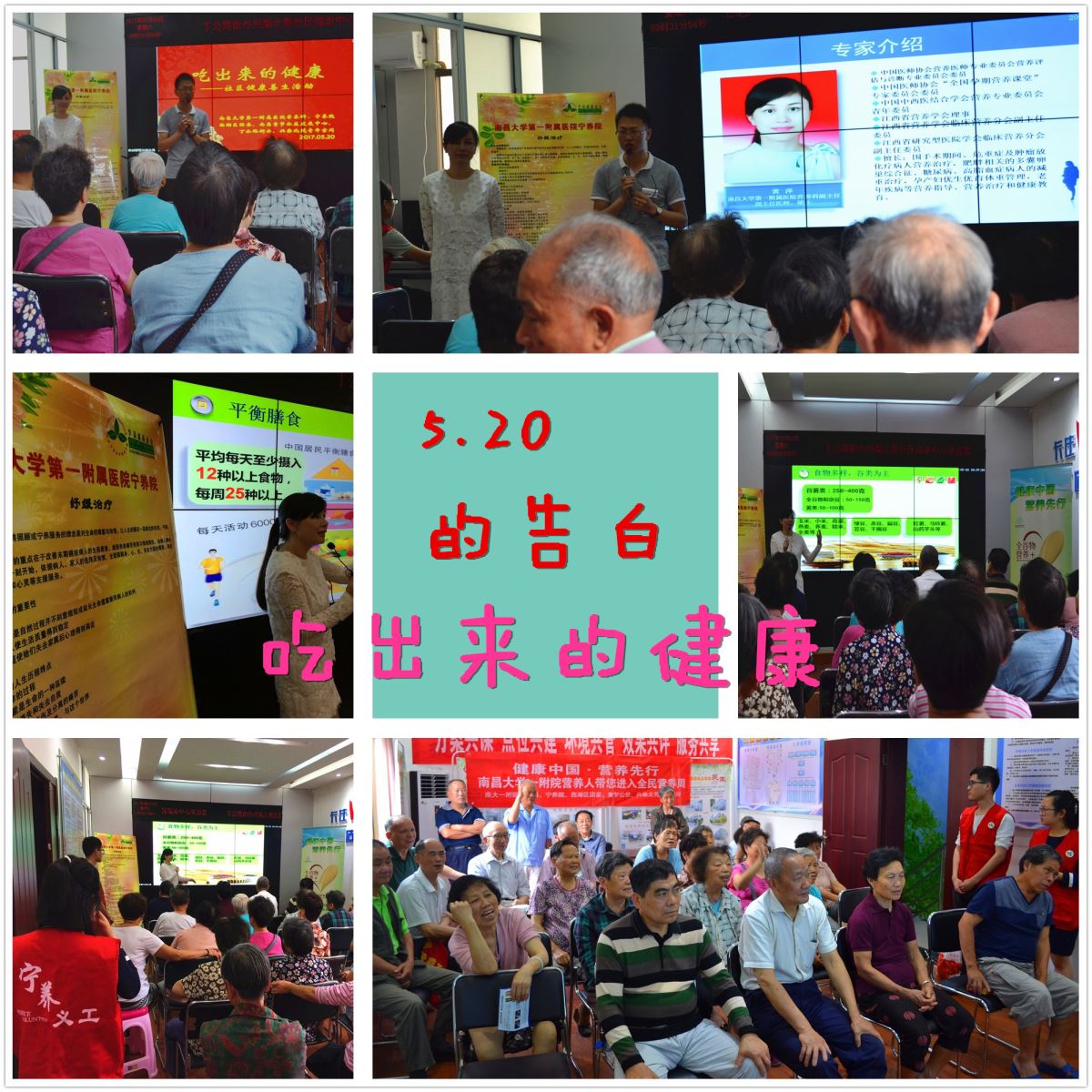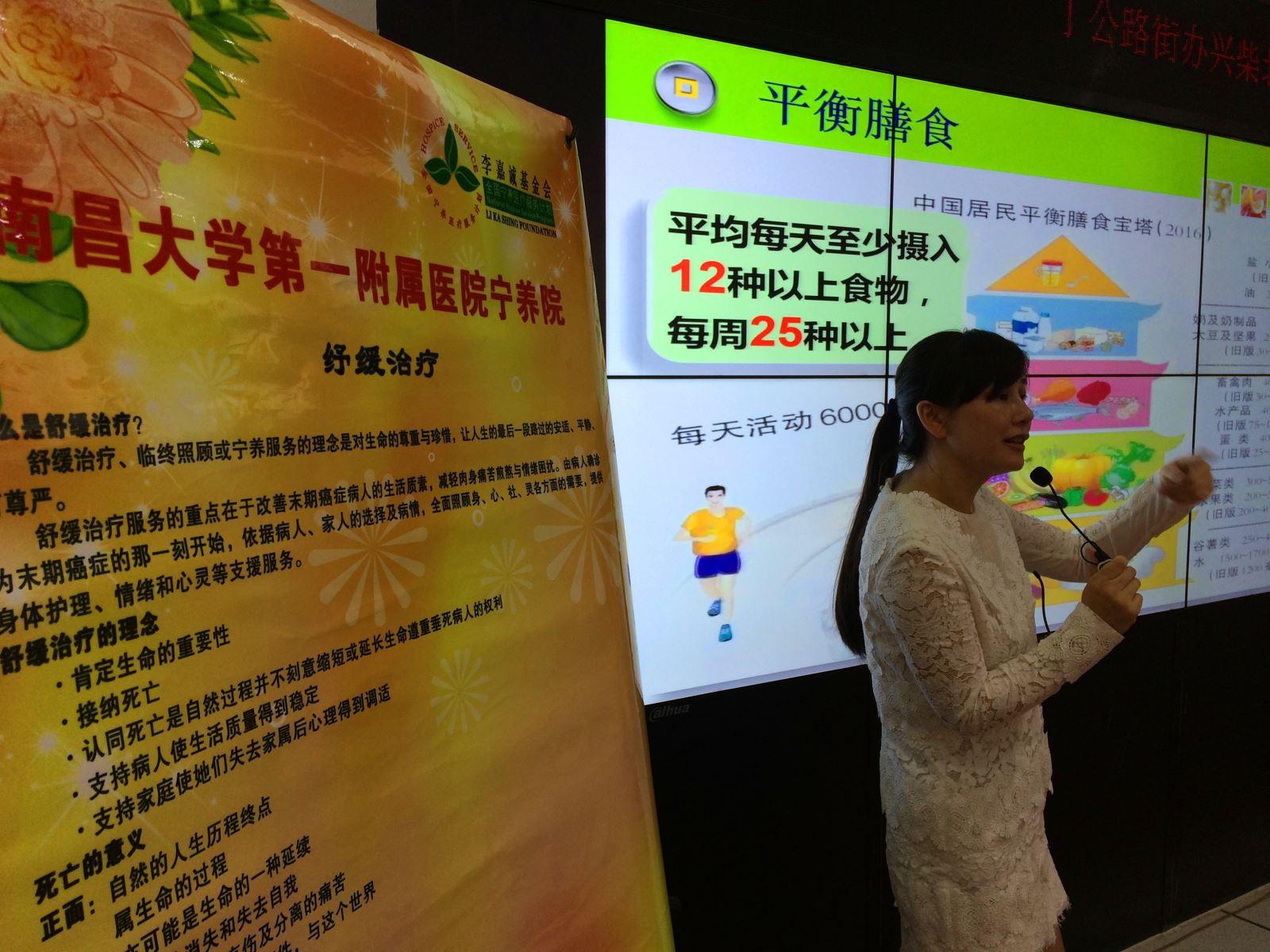 为向公众宣传宁养善生理念,南昌宁养院在2017年全民营养周之际,与南昌大学第一附属医院营养科合作,希望从合理营养、平衡膳食切入善生教育。2017年5月20日,南昌大学第一附属医院宁养院、营养科联合西湖区团委南昌童梦公益发展中心、兴柴北苑青年空间在兴柴北苑社区会议室开展“吃出来的健康”社区善生健康宣教活动。