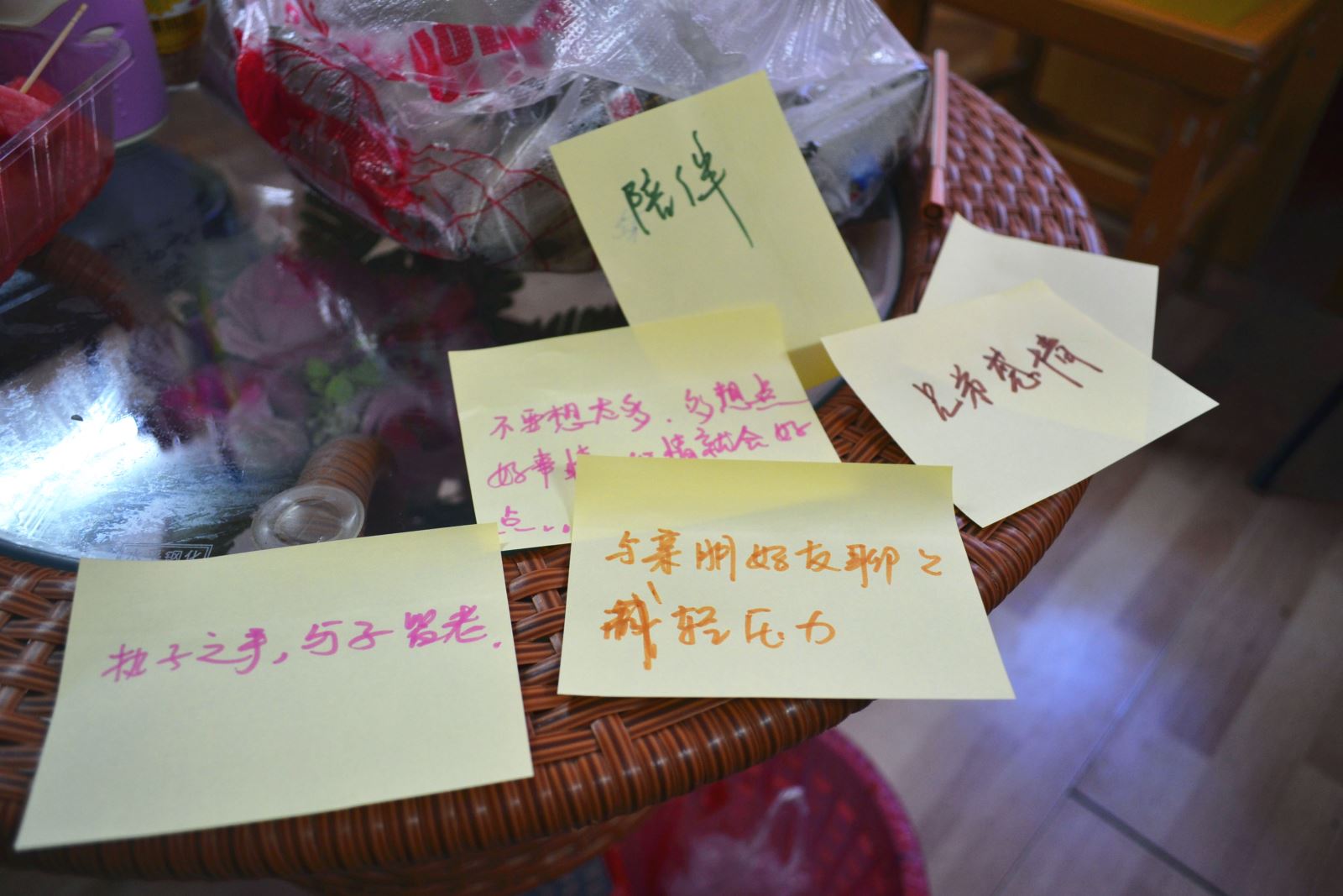 然后,社工带领家属反思当面对照顾患者中的各种压力、患者的各种情绪等困难,家属仍耐心照护患者背后的动力,幫助家属探寻自我的能量。家属道出了关键词“爱”与“责任”,写下了支撑自己面对困难的心得,例如“兄弟之情”、“执子之手,与子偕老”的承诺、“不要想太多,多想点好事情,心情就会好点”、“与亲朋好友聊聊,减轻压力”……