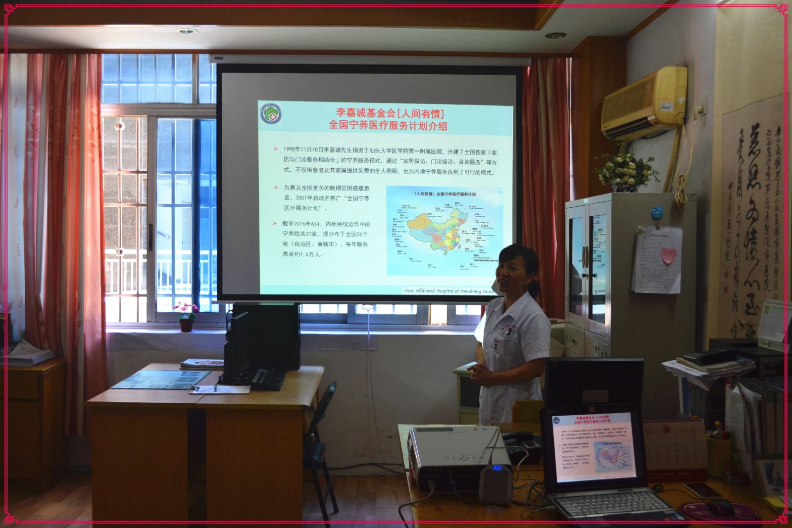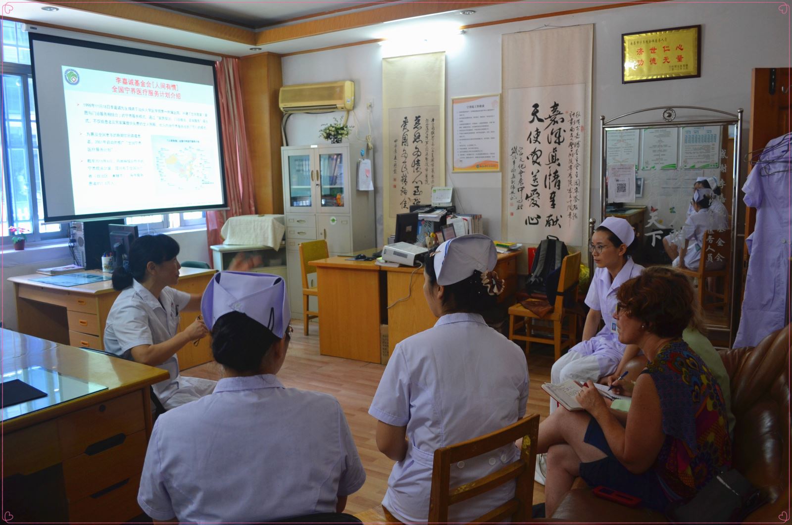 接着,王主任 通过PPT展示宁养院医生、护士、社工、义工等从疼痛、护理、心理疏导、家属支持、哀伤辅导、义工服务等方面介绍宁养服务开展的情况。两位总护理长非常认真的倾听分享,并做起了笔记。