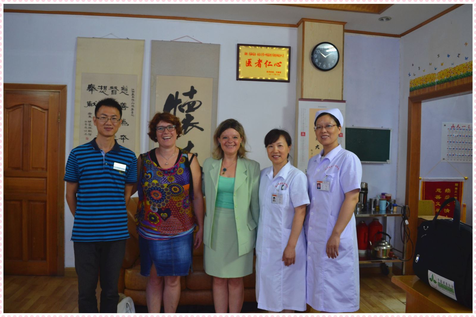 宁养院与法国两位总护理长进行了近一个半小时愉快的交流,宁养院宣传了宁养项目及具体服务内容,同时也了解了法国医疗护理服务情况。最后宁养院护士、社工与两位法国总护理长合影留念。