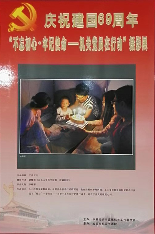 为庆祝建国69周年,汕头市直属机关工作委员会在国庆期间举办了“不忘初心•牢记使命——党员在行动”摄影展。全市各机关单位投稿作品近400件,经专业摄影人士的评选后展出作品100件。汕头宁养院所属单位汕头大学医学院第一附属医院报送宁养院的《宁养欣光》在众多佳作中脱颖而出,获得摄影展最高荣誉“一等奖”。