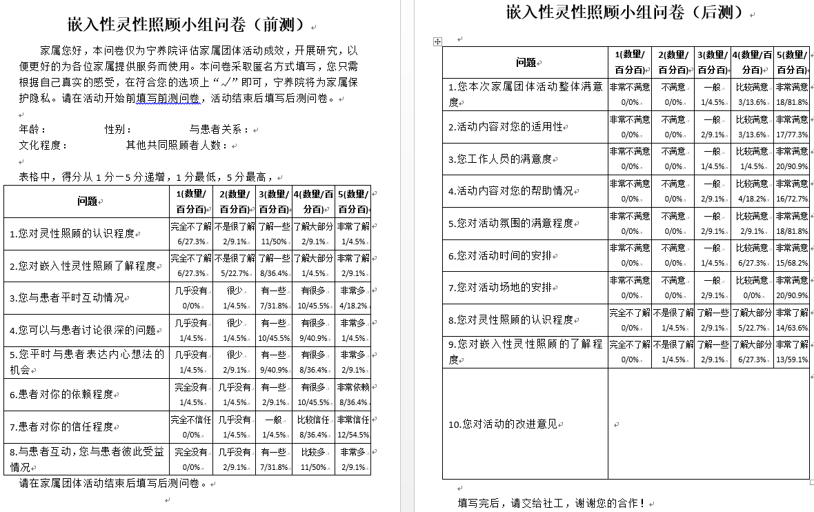 为了让家属了解灵性及嵌入性灵性照护的基本概念,以及为患者提供灵性照护的方法,缓解家属照护患者的压力,南昌宁养院于2018年12月开展三次“嵌入性灵性照护”家属教育团体活动,家属对此活动的整体满意度达95.5%。