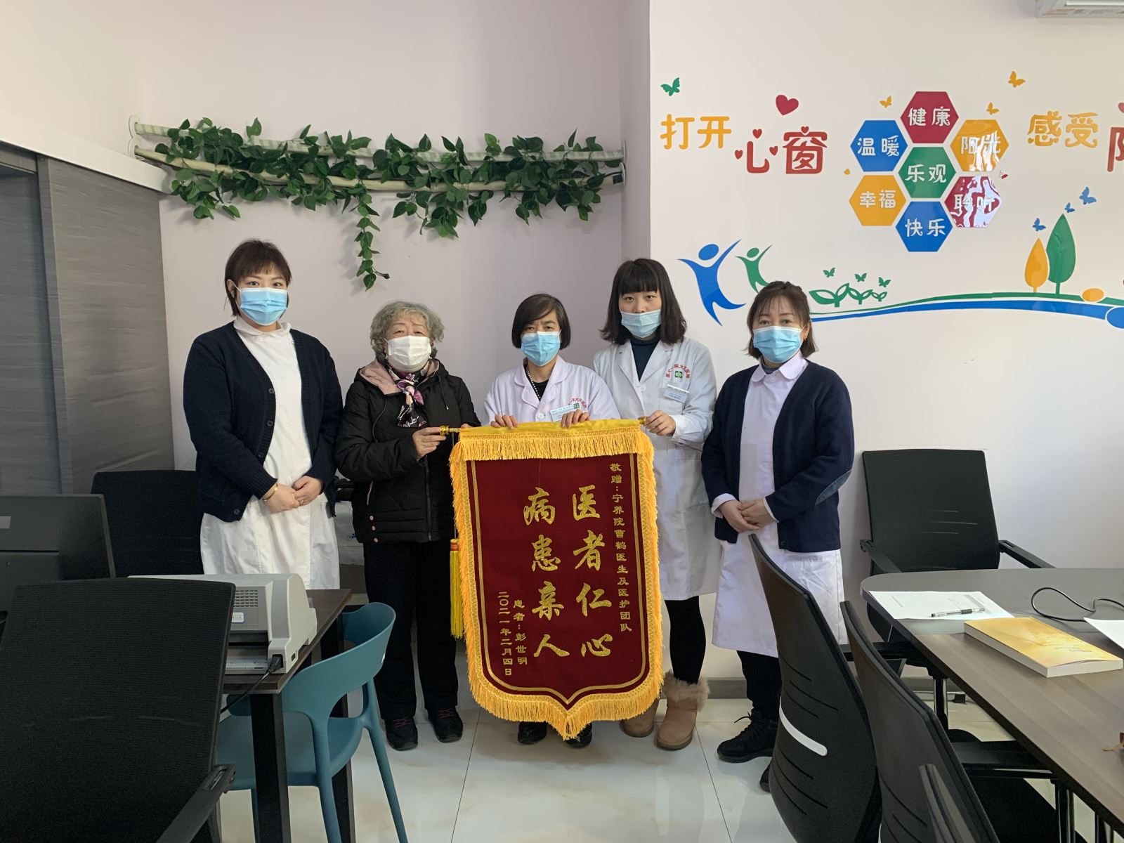 临近下午活动开始前,一个熟悉的身影出现在宁养院办公室,她是一位肝癌患者的爱人贾阿姨,手里拿着一面锦旗,感谢李嘉诚先生及宁养院给予病人及家属无私的关怀!患者在2020年12月7日接受宁养服务,在服务期间,患者不仅疼痛得到有效控制,心理也得到了舒缓 …… 家属赠送锦旗是对我们宁养服务工作的肯定。