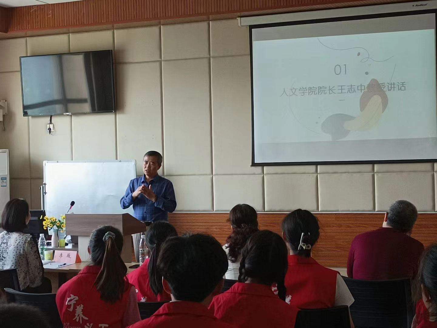 人文社会科学学院院长王志中总结回顾了学校宁养义工工作的近十年的发展历程。从2013年至今,学校人文社会科学学院与山西省肿瘤医院宁养院通力合作,开展了长期、稳定、有效的宁养义工服务,广大老师和义工学生秉持“团结、友爱、互助、奉献” 的志愿精神,为癌症晚期宁养患者及其家属开展“全人、全家、全程、全队、全社区”的照顾,在全国范围内产生了较大的影响,累计有300余名同学加入到宁养工作团队中。王院长从宁养使命、宁养工作、宁养成长三个方面为义工同学们开展宁养志愿工作的相关培训。王院长强调,义工服务中义工要主动积极参与,与案主共同发现生活的美好,体验生命的价值;要端正自身工作态度,提升技能水平,传承宁养精神;要实现专业性成长、开拓性成长和综合性成长,秉承社会工作理念,发扬志愿服务精神。