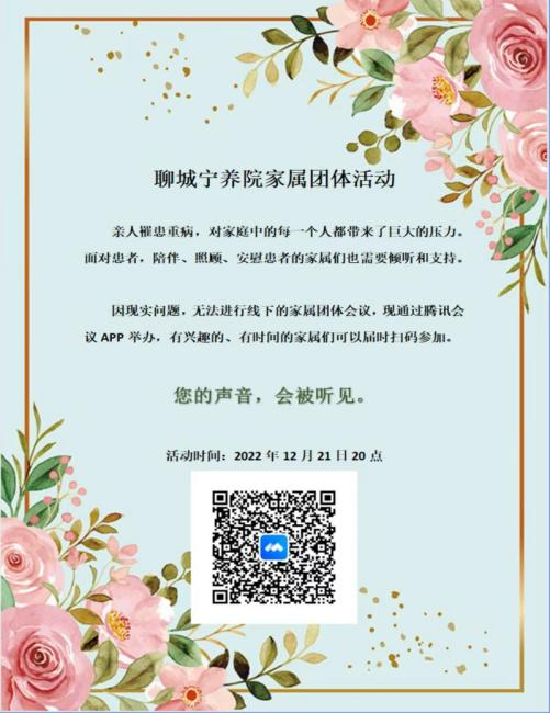 囿于疫情的影响,线下团体活动受限,聊城市人民医院宁养院于2022年12月21日晚八点于腾讯会议举办了第一次线上家属团体活动——您的声音会被听见,目的是让家属们的需求被听到并予以关注和支持。