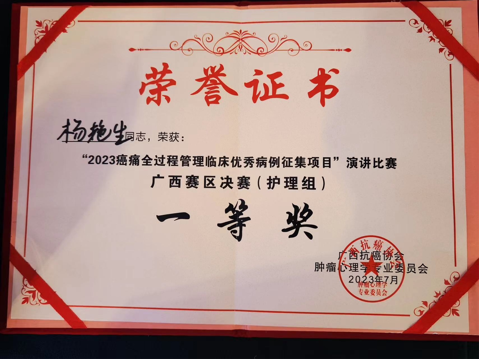 2023年7月7日-8日,由中国抗癌协会肿瘤整体评估专业委员会主办,广西抗癌协会肿瘤心理学专业委员会承办的“2023年癌痛全过程管理临床优秀病例征集项目”广西决赛在南宁如期举行。柳州市工人医院宁养院护师杨艳生在比赛中脱颖而出,斩获一等奖,将代表广西参加全国半决赛。