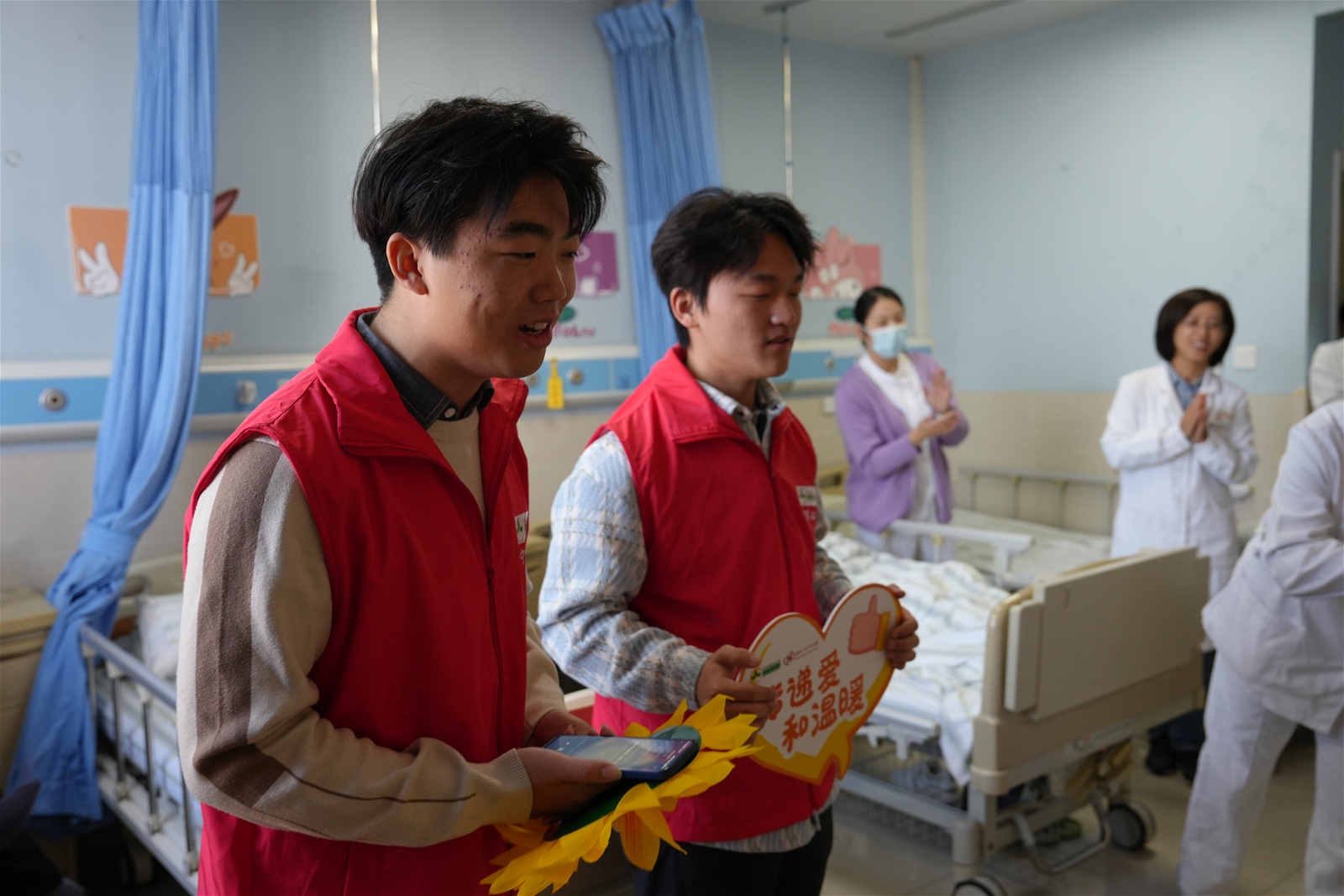 后来我们去了老年病房。那里的空气更沉重。刚进去,一位老人痛苦地说自己“浪费了社会资源”。陈老师走上前去,温柔地接住了那份自责。她没有劝慰,而是用故事、用共情,一点一点撬开那堵悲伤的墙。很快,病房里的人都加入了谈话。