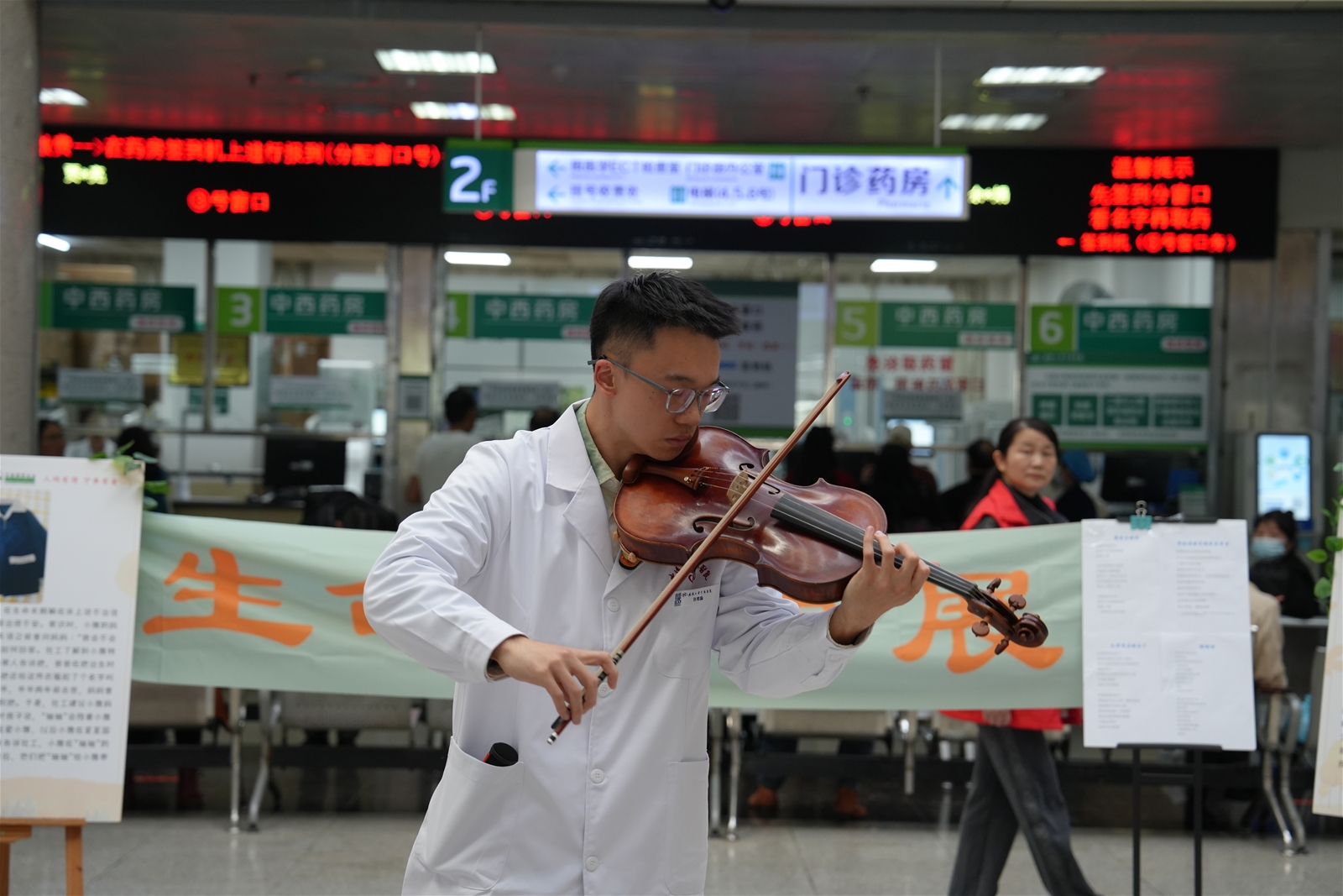 武汉大学临床医学博士生许君淼同学的一曲中提琴独奏,串联起《梁祝》《茉莉花》等经典旋律,深沉舒缓的琴声叩击人心,迅速吸引了往来人群的注意。紧随其后的宁养之歌《守护》及《夜空中最亮的星》演唱由武汉大学基础医学专业的郭翟闻同学和动力与机械学院的杨季成同学带来,短短十分钟的快闪,放缓了门诊匆忙的脚步。