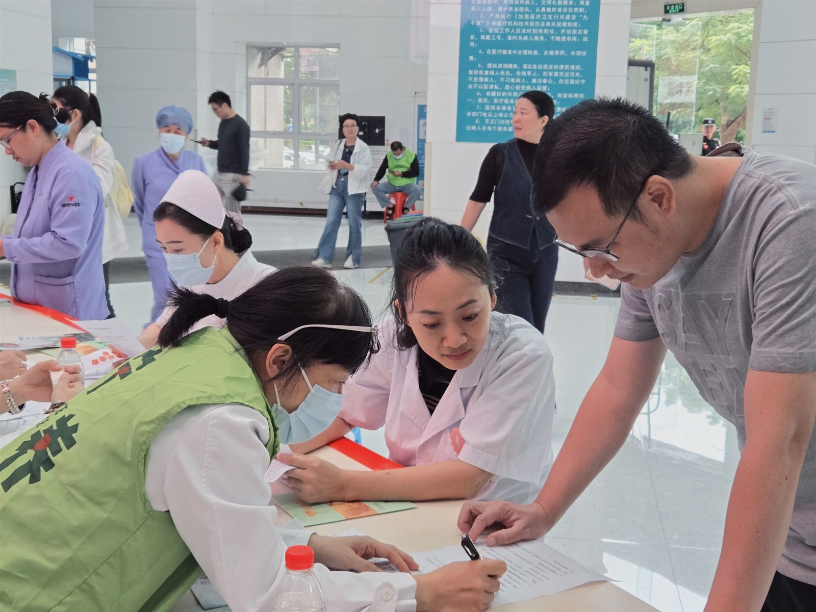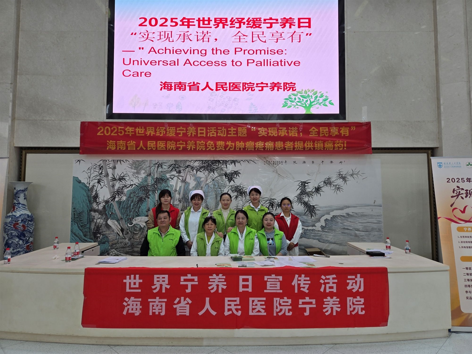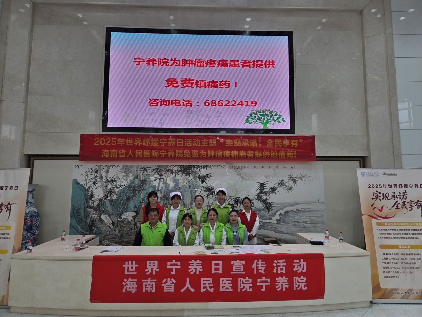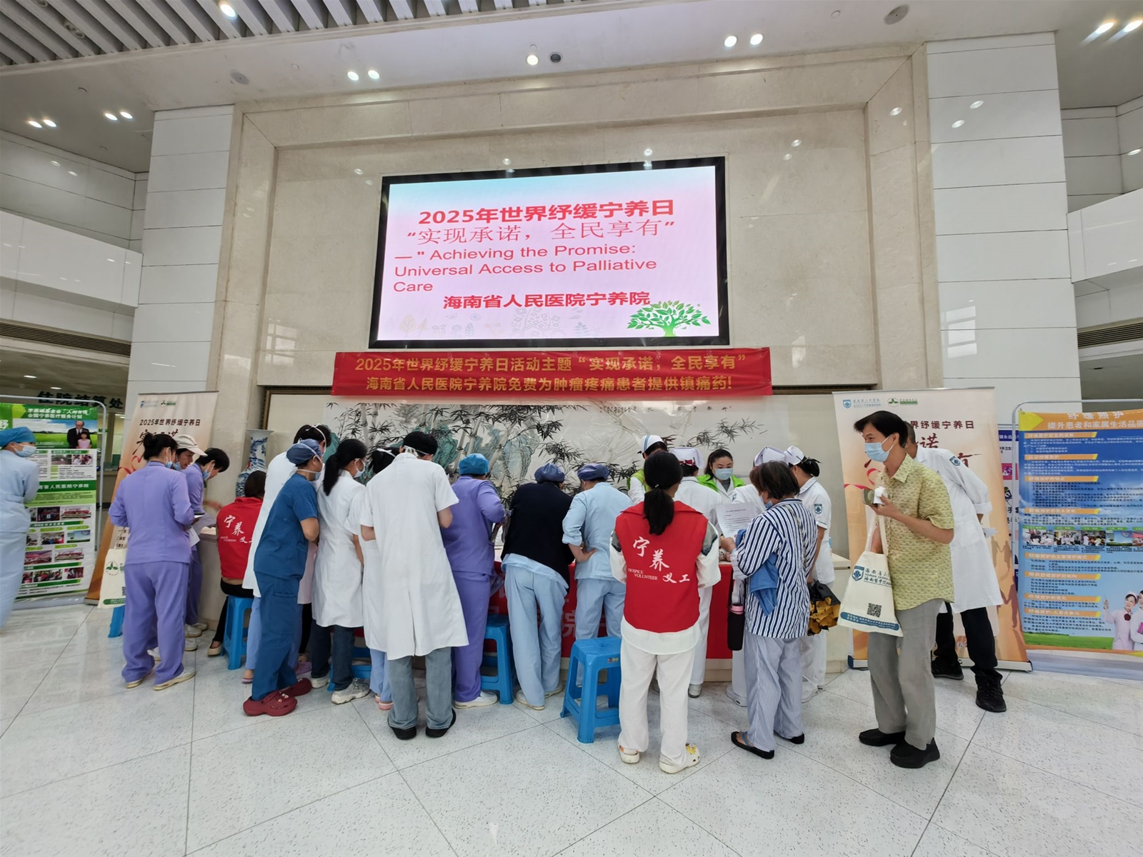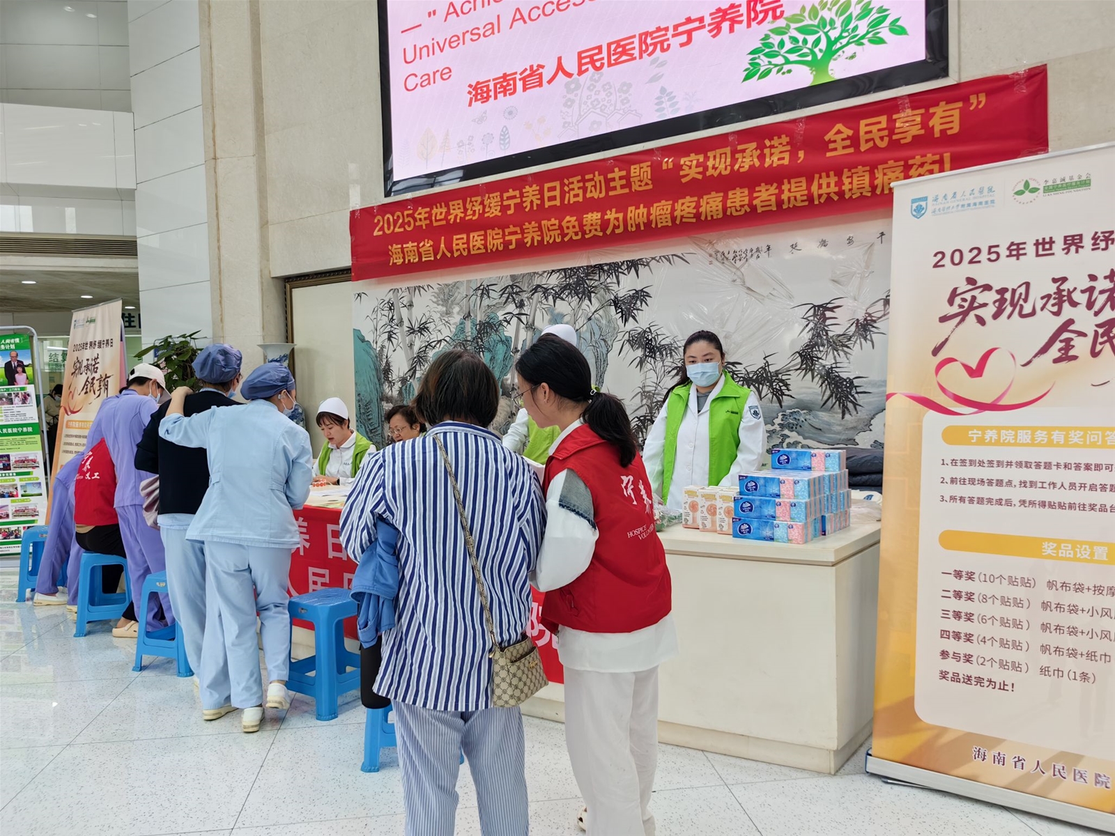 二、10 月 22 日上午,海南省人民医院外科楼大厅内温情涌动,一场以 “实现承诺,全民享有” 为主题的世界纾缓宁养日有奖问答活动顺利开展。活动以互动科普为核心,打破公众对安宁缓和医疗的认知壁垒,向患者、家属及院内职工传递生命关怀的温度,吸引院内医务人员、患者及家属百余人积极参与。参与者或独立思考,或轻声探讨,答题正确者可获得宁养院医护人员发放的贴心小礼品,现场氛围热烈而温馨。宁养院医护团队同步提供一对一咨询服务,针对长期疼痛管理、营养支持等问题给出个体化建议,详细介绍我院 “症状干预 + 心理支持 + 家属辅导” 的全流程宁养服务模式。也涵盖 “宁养服务申请流程”“家属哀伤辅导技巧” 等实用内容,部分宣教融入 “四道人生”(道歉、道谢、道爱、道别)等人文理念。义工们则为前来参加活动的人介绍本次活动和引导现场秩序。现场来了好几位咨询宁养服务的住院患者及家属,其中,有一位老太太真挚的感谢让人影响深刻,她伸出满是针孔的手背说:“我就是恶性晚期肿瘤的患者,还真不知道有这样的一个慈善机构呢,你们的存在让我们多了一份依靠与感动,非常的感谢李嘉诚基金会和海南省人民医院的大爱与善举,让民众得以享有生命最后一程的体面与尊严”。老太太的有感而发正好体现了本次宣传活动的意义。同时,现场也来了好多院内年轻的医务工作者,宁养院的医护人员耐心地为他们介绍着宁养院的服务流程和内容讲解,她们纷纷表示,这是一个多么有爱的部门啊!以后我们也会推荐更多有需要的患者来享有这份爱的守护。