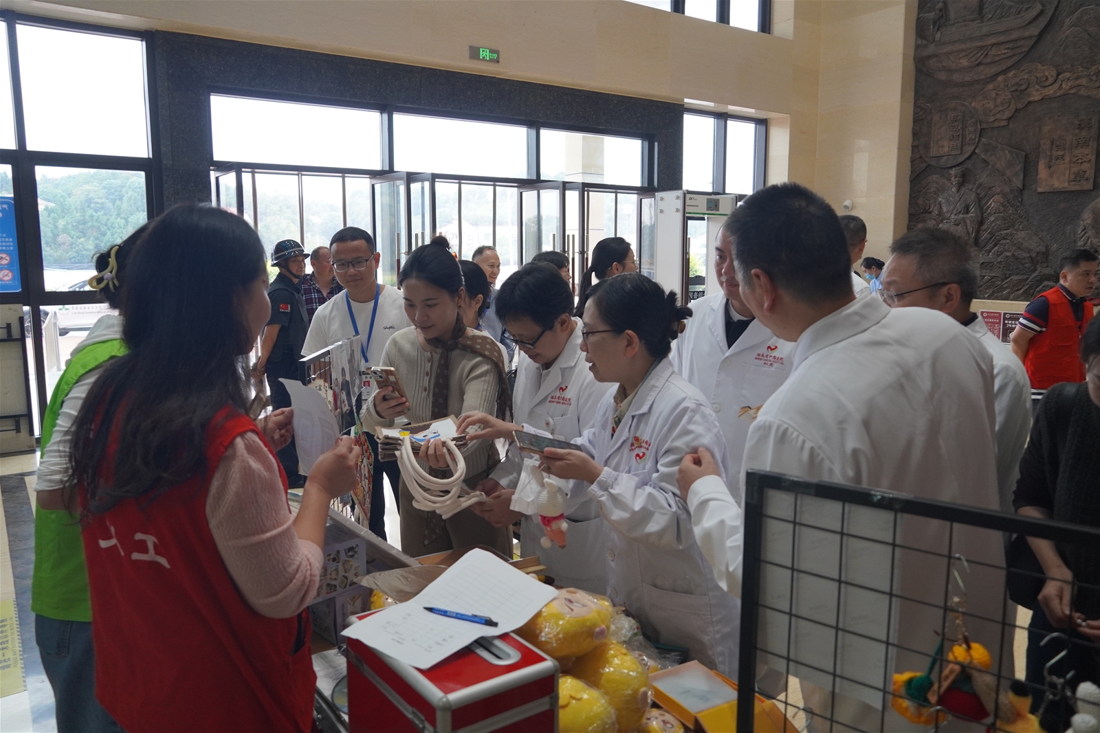 门诊大厅里,一场精心筹划的爱心义卖正在温情上演。展台上,手工编织的玩偶裹着毛线的柔软触感,手绘的帆布包印着充满生命力的色彩,精巧的画扇作品透着灵动的创意……这些精美的物件都出自肿瘤患者、医护人员与义工之手,每一件背后都藏着一段与生命抗争、与爱相关的动人故事。