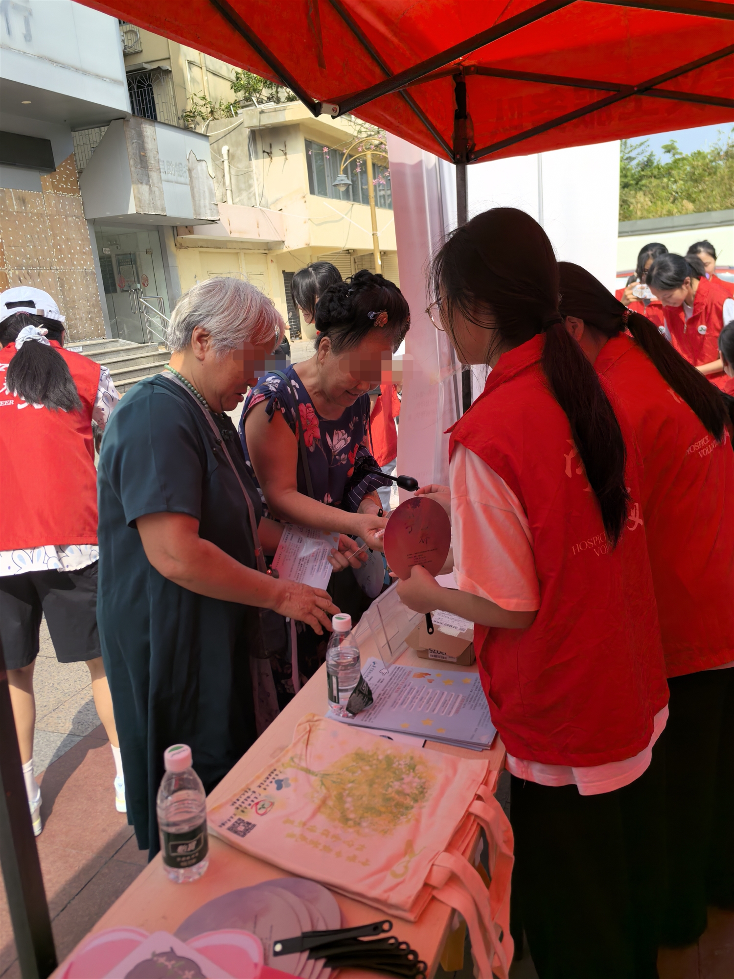 活动伊始,我们在步行街广场搭建帐篷,进行布置。此次活动中,我主要负责引导大家参与明信片祝福语活动,通过呼吁大家对晚癌患者及其家属多些了解、关注及支持,由语言祝福的力量给他们带来温暖,并呼吁大家可积极参与手举暖语KT板拍照支持及留念。