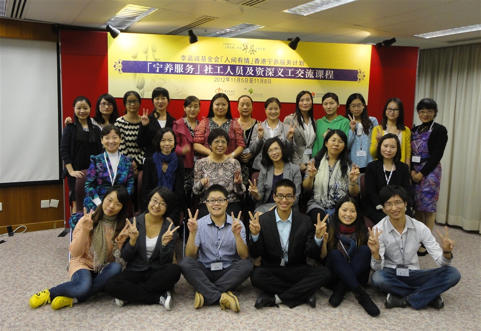 『2012宁养服务社工人员及资深义工交流课程』于11月5-8日期间举行,李嘉诚基金会「人间有情」全国宁养医疗服务计划选派来自国内17所宁养院的8名社工人员和11名资深宁养义工赴港参与本次交流课程。全体学员在3.5天内完成了17.5小时的理论课程及6.5小时的宁养中心实地考察,最后获得香港医院管理局进修学院颁发的结业证书。